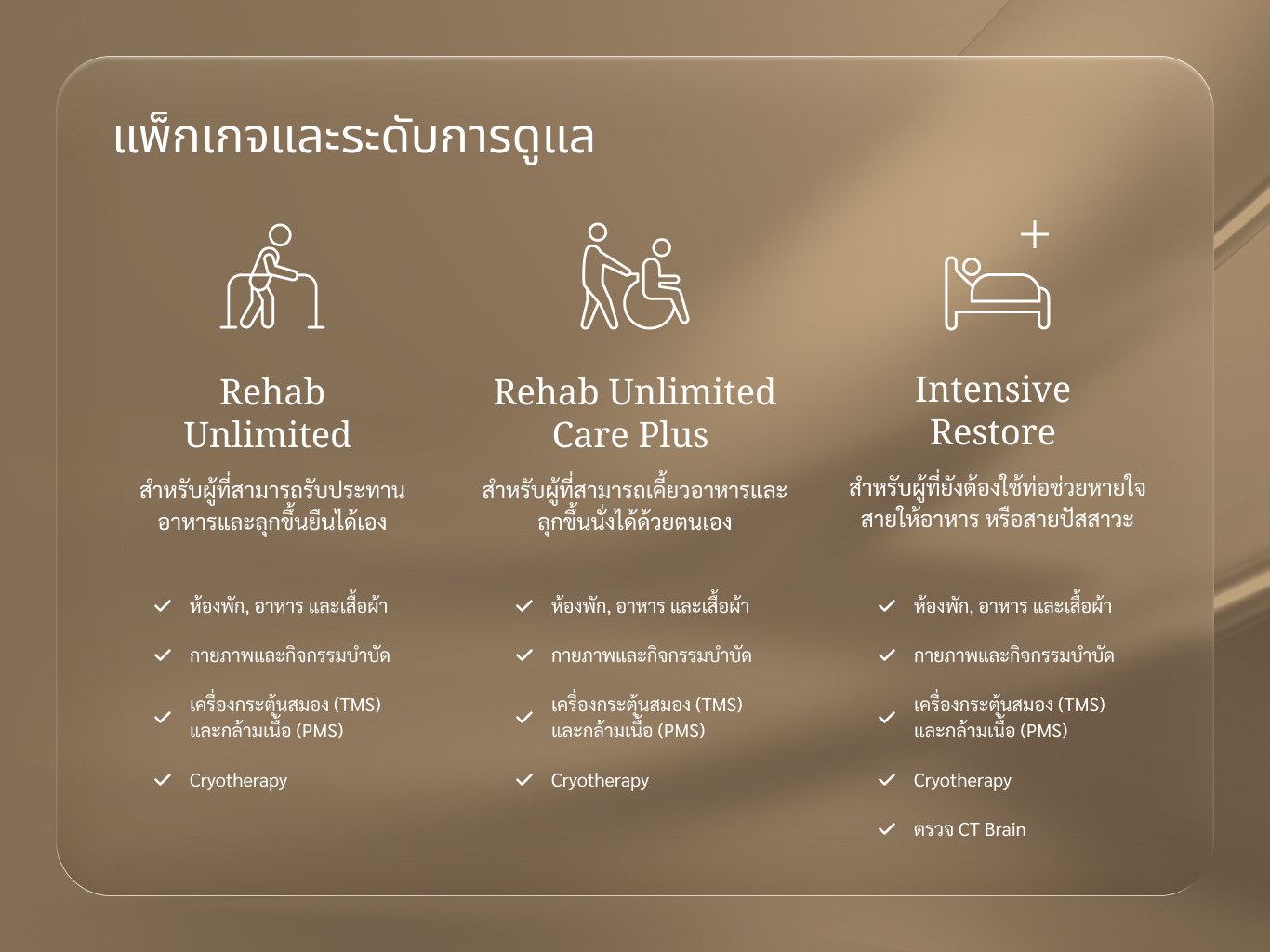 - Intensive Restore สำหรับผู้ที่ยังใส่ท่อช่วยหายใจ หรือยังใส่ท่อสายยางอาหาร หรือยังใส่ท่องสายยางปัสสาวะ หรือยังไม่เข้าเกณฑ์ของ Rehab Unlimited และ Rehab Unlimited Care Plus