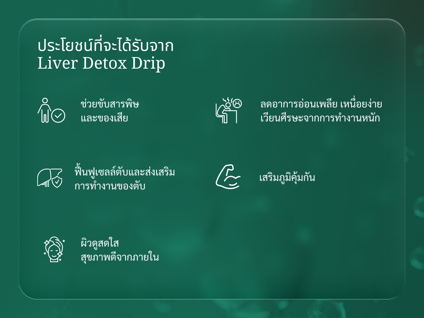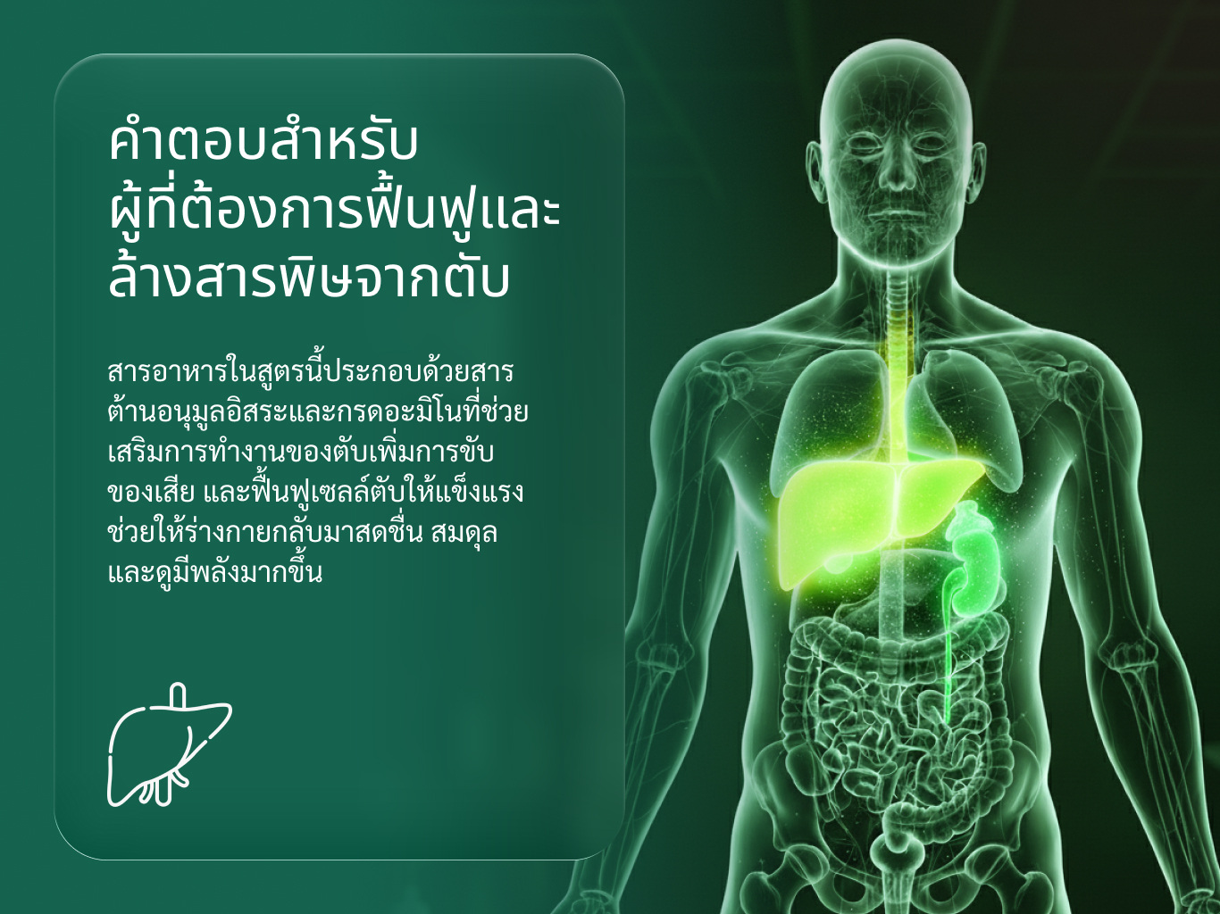 สารอาหารในสูตรนี้ประกอบด้วยสารต้านอนุมูลอิสระและกรดอะมิโนที่ช่วยเสริมการทำงานของตับ เพิ่มการขับของเสีย และฟื้นฟูเซลล์ตับให้แข็งแรง ช่วยให้ร่างกายกลับมาสดชื่น สมดุล และดูมีพลังมากขึ้น