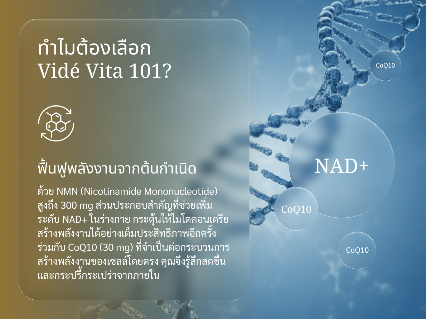 - ส่วนประกอบหลัก: NMN (Nicotinamide Mononucleotide) และ Co Q10