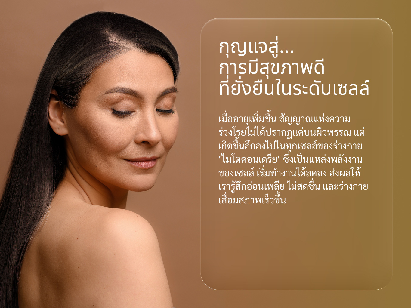 เมื่ออายุเพิ่มขึ้น สัญญาณแห่งความร่วงโรยไม่ได้ปรากฏแค่บนผิวพรรณ แต่เกิดขึ้นลึกลงไปในทุกเซลล์ของร่างกาย "ไมโตคอนเดรีย" ซึ่งเป็นแหล่งพลังงานของเซลล์ เริ่มทำงานได้ลดลง ส่งผลให้เรารู้สึกอ่อนเพลีย ไม่สดชื่น และร่างกายเสื่อมสภาพเร็วขึ้น