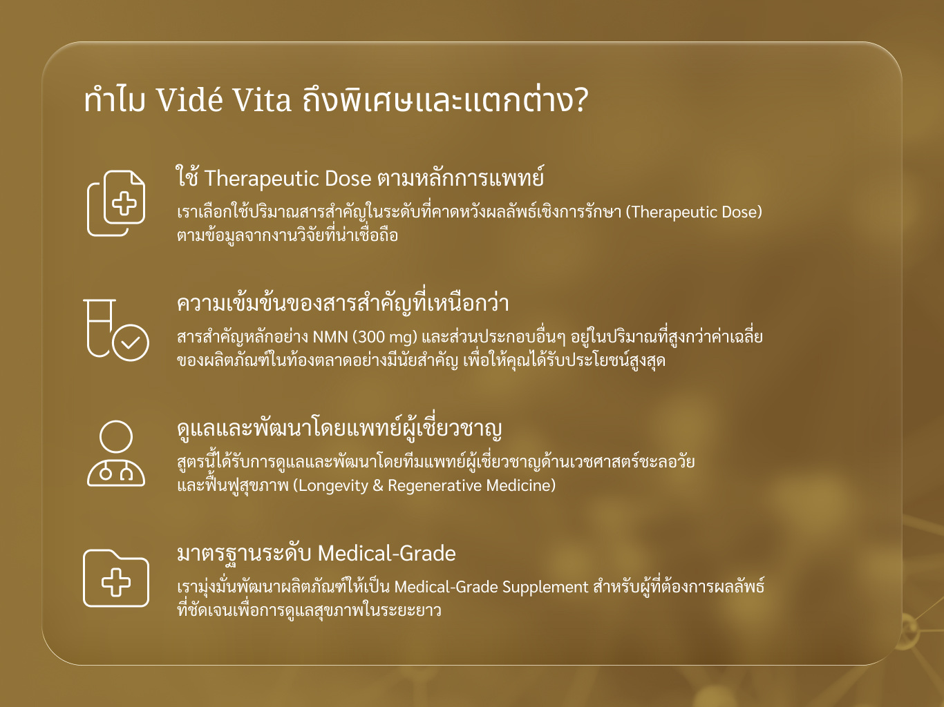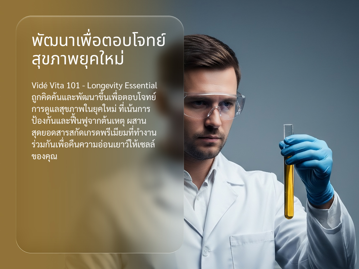 Vidé Vita 101 - Longevity Essential ถูกคิดค้นและพัฒนาขึ้นเพื่อตอบโจทย์การดูแลสุขภาพในยุคใหม่ ที่เน้นการป้องกันและฟื้นฟูจากต้นเหตุ ผสานสุดยอดสารสกัดเกรดพรีเมียมที่ทำงานร่วมกันเพื่อคืนความอ่อนเยาว์ให้เซลล์ของคุณ
