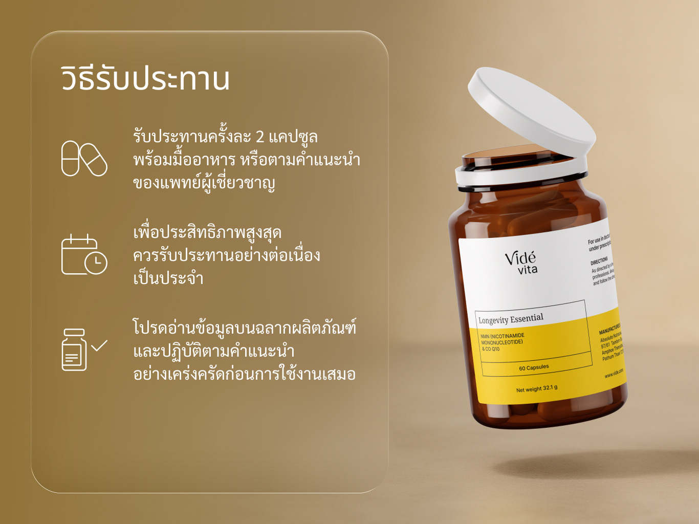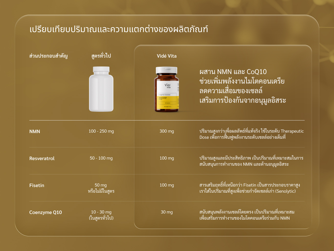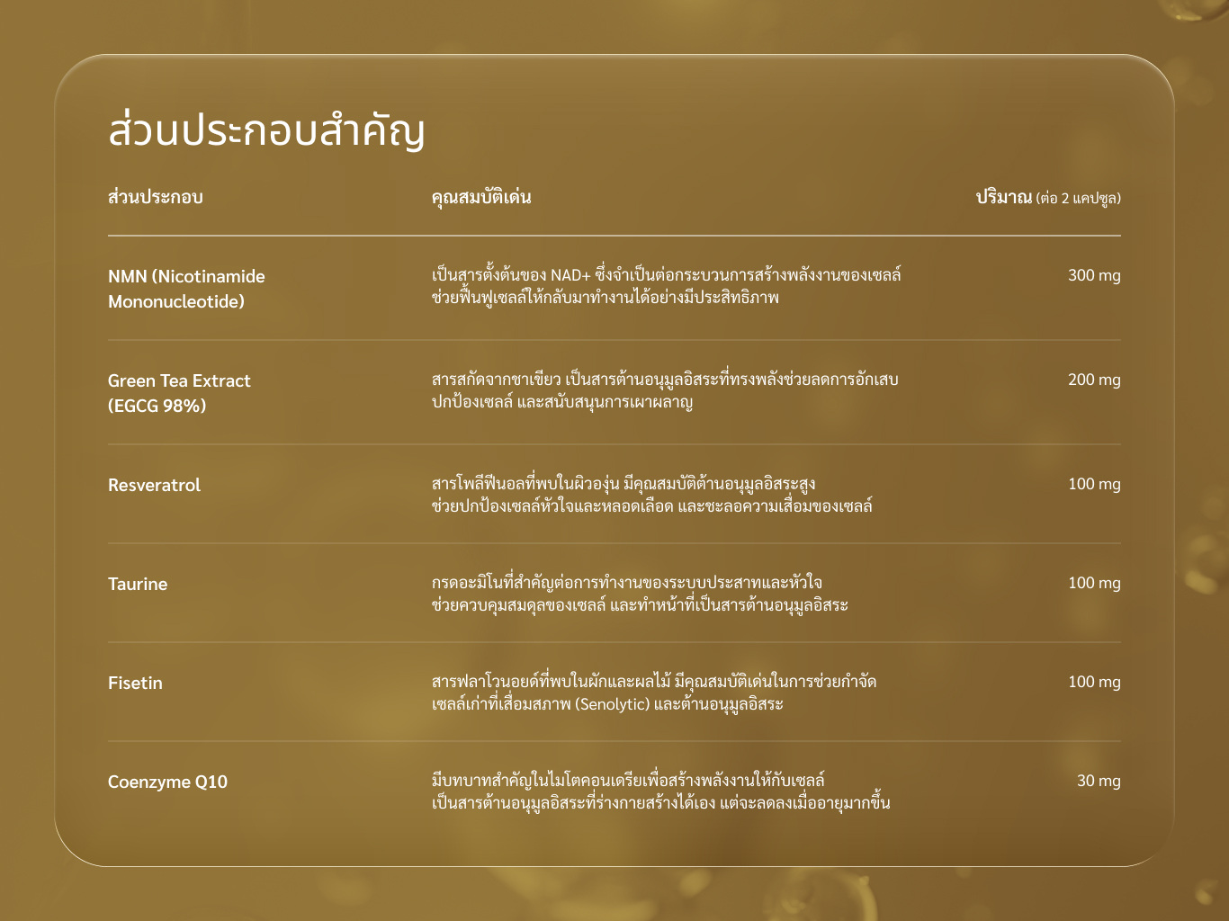 | Coenzyme Q10 | 30 mg | 10 - 30 mg (ในสูตรทั่วไป) | สนับสนุนพลังงานเซลล์โดยตรง: เป็นปริมาณที่เหมาะสมเพื่อเสริมการทำงานของไมโตคอนเดรียร่วมกับ NMN |