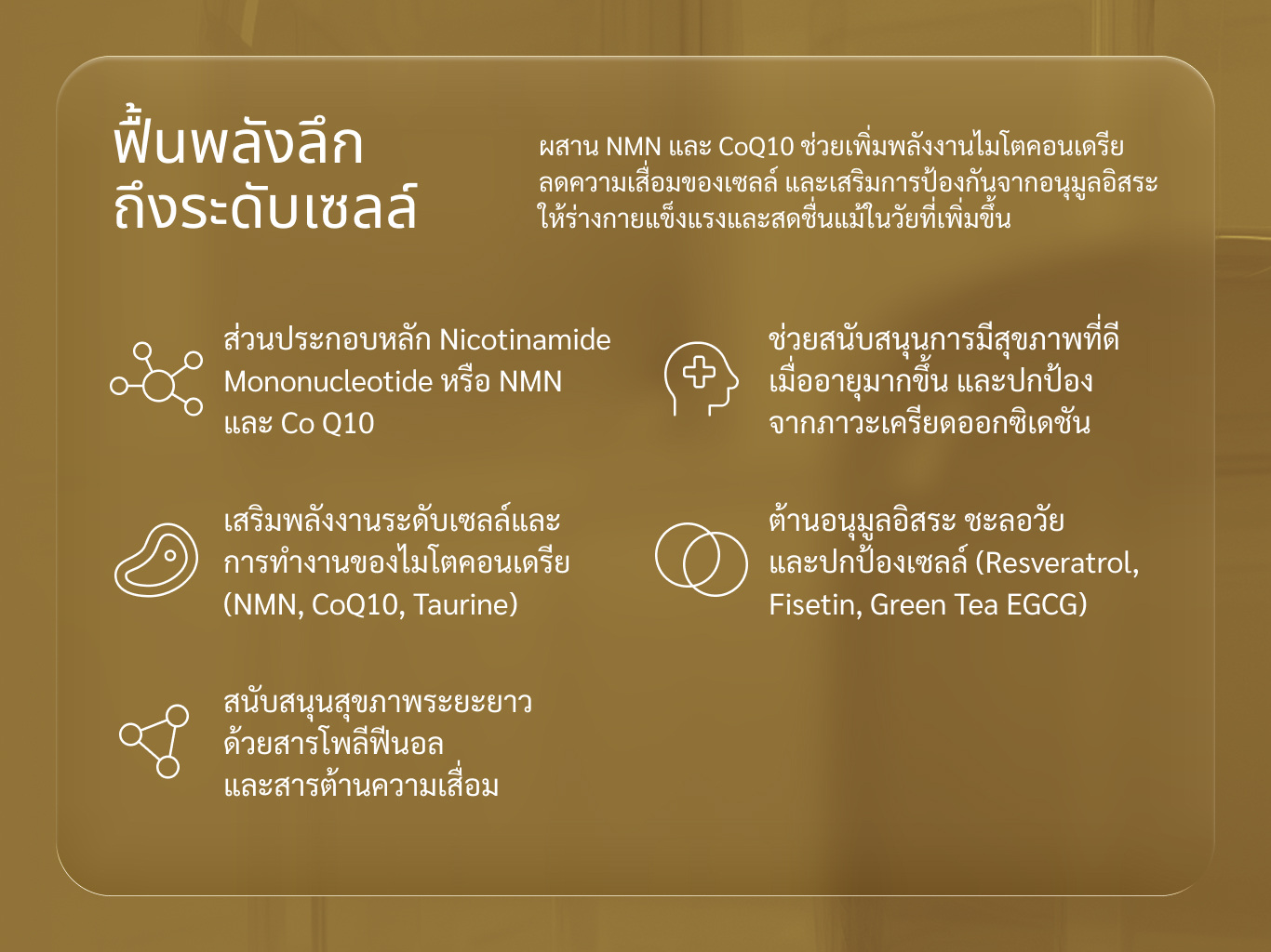 - เสริมพลังงานระดับเซลล์และการทำงานของไมโตคอนเดรีย (NMN, CoQ10, Taurine)