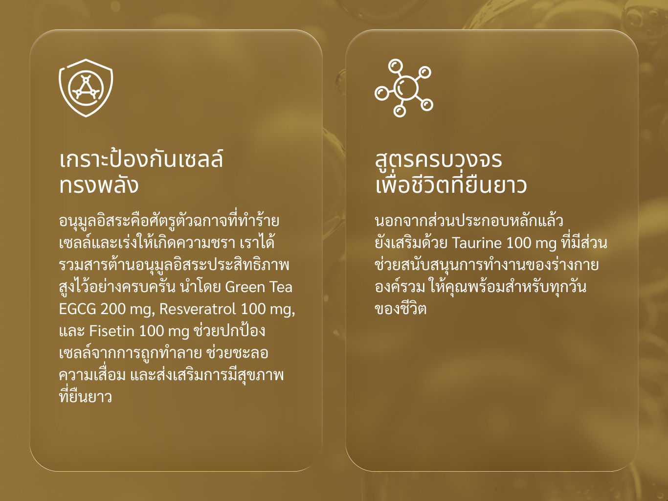 - ต้านอนุมูลอิสระ ชะลอวัย และปกป้องเซลล์ (Resveratrol, Fisetin, Green Tea EGCG)