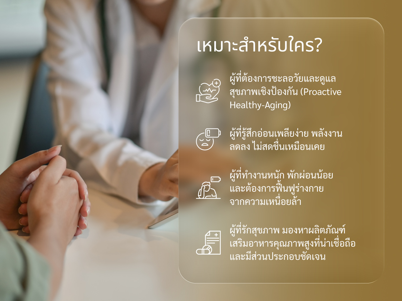 - ผู้ที่ต้องการชะลอวัยและดูแลสุขภาพเชิงป้องกัน (Proactive Healthy-Aging)