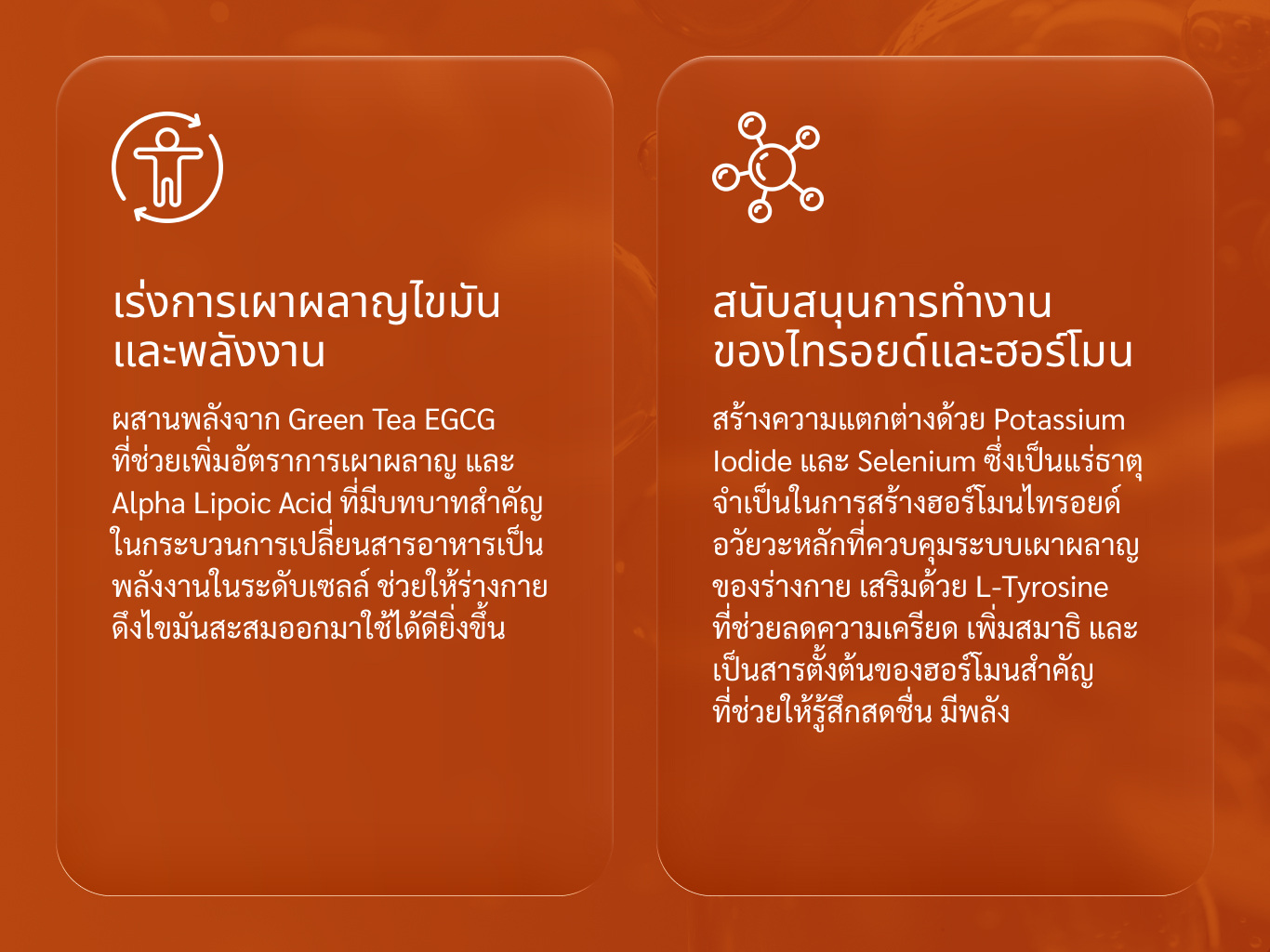• สนับสนุนการทำงานของไทรอยด์และฮอร์โมน: สร้างความแตกต่างด้วย Potassium Iodide และ Selenium ซึ่งเป็นแร่ธาตุจำเป็นในการสร้างฮอร์โมนไทรอยด์ อวัยวะหลักที่ควบคุมระบบเผาผลาญของร่างกาย เสริมด้วย L-Tyrosine (200 mg) ที่ช่วยลดความเครียด เพิ่มสมาธิ และเป็นสารตั้งต้นของฮอร์โมนสำคัญที่ช่วยให้รู้สึกสดชื่น มีพลัง