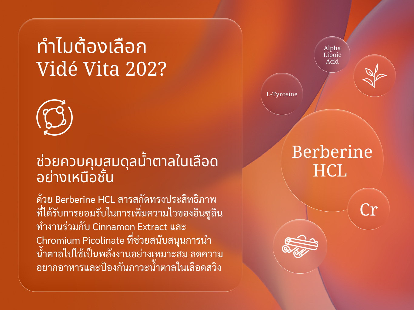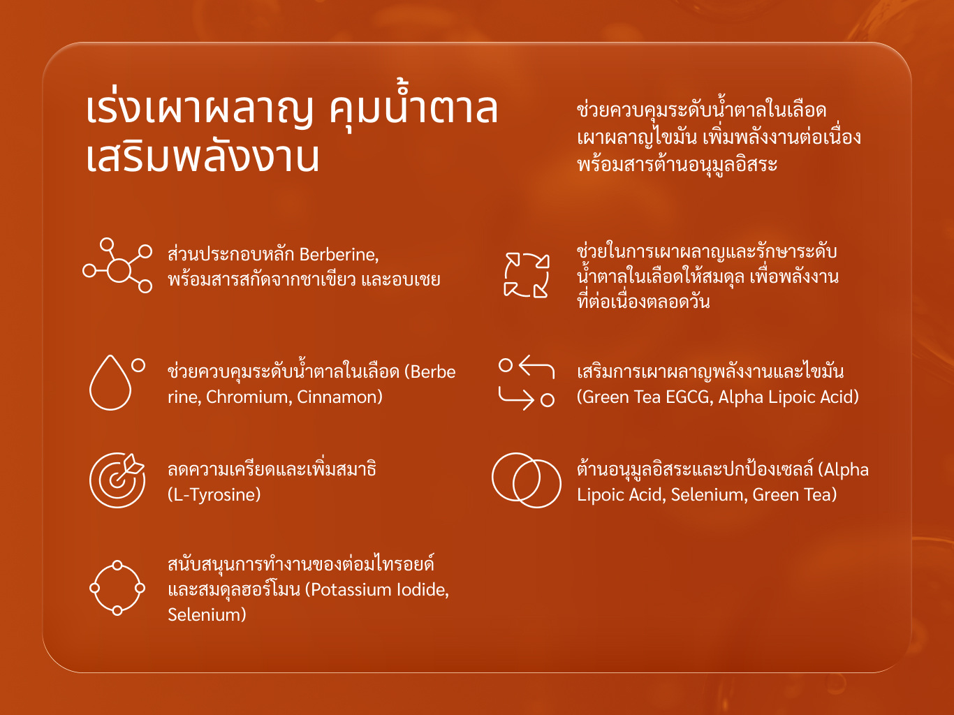 • ช่วยควบคุมระดับน้ำตาลในเลือด (Berberine, Chromium, Cinnamon)