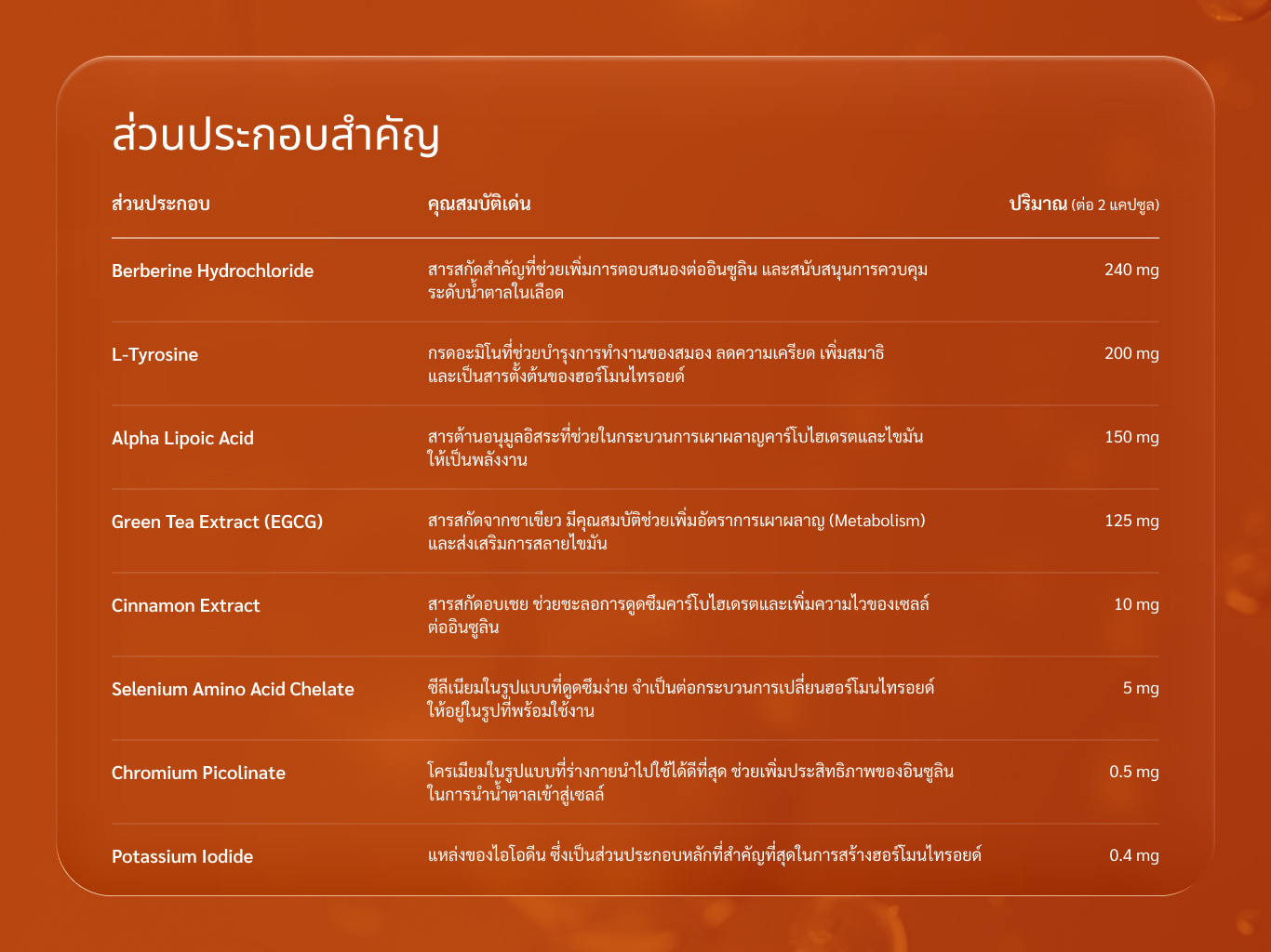 • สูตรที่ครอบคลุมและเหนือกว่า: นอกจากจะเน้นเรื่องการคุมน้ำตาลแล้ว สูตรของเรายังใส่ใจถึง การสนับสนุนต่อมไทรอยด์ด้วยไอโอดีนและซีลีเนียม ซึ่งเป็นการดูแลระบบเผาผลาญที่ต้นเหตุ