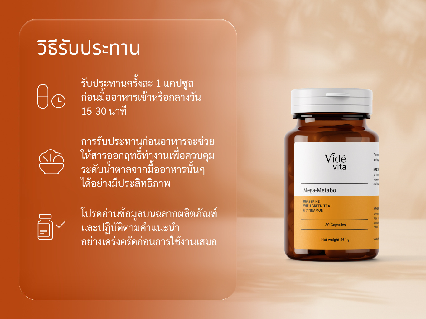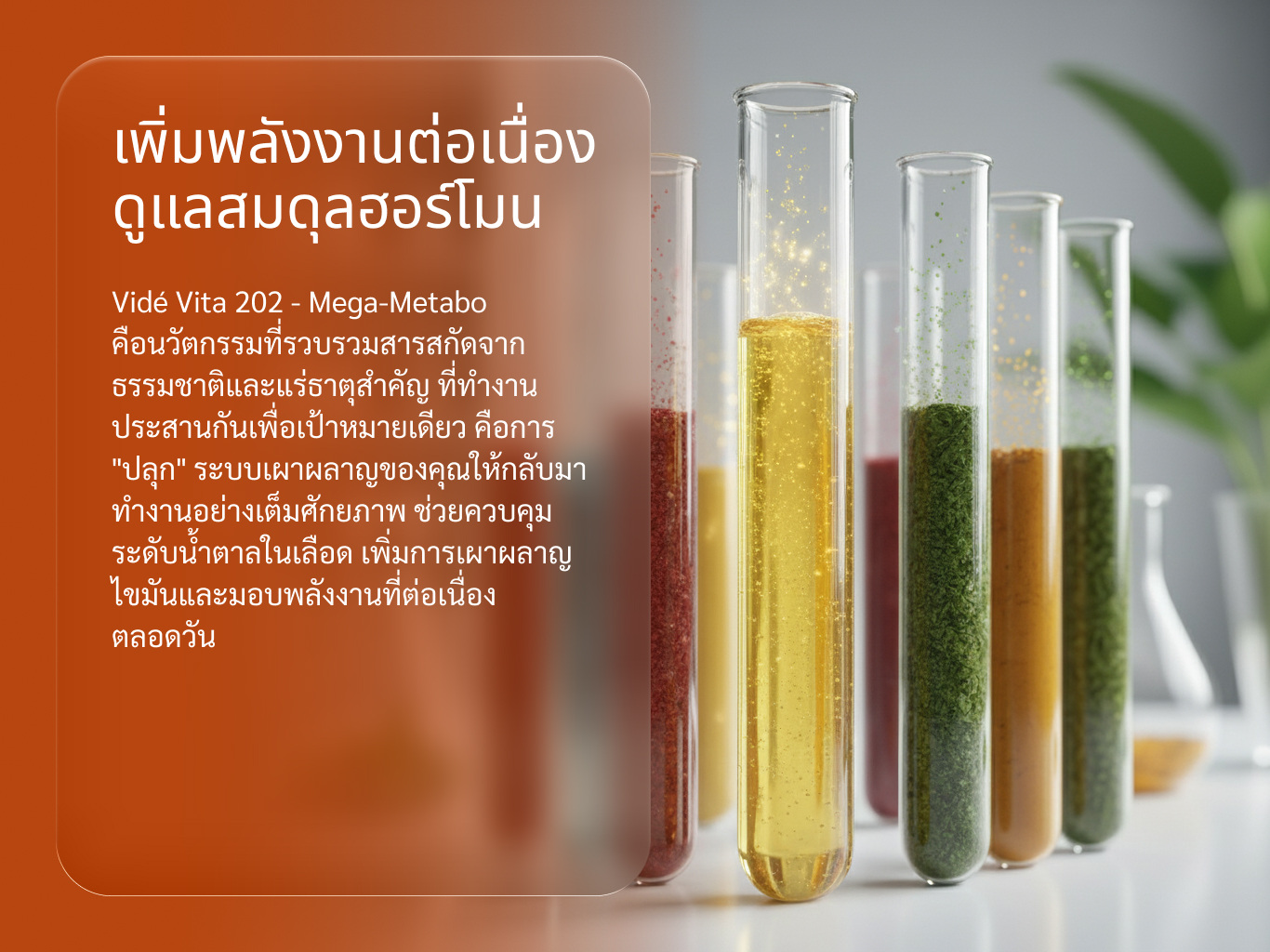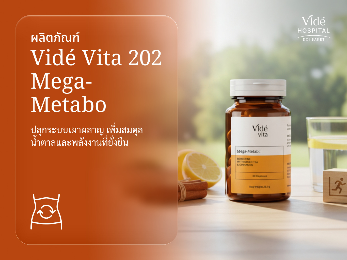 Vidé Vita 202 - Mega-Metabo คือ นวัตกรรมที่รวบรวมสารสกัดจากธรรมชาติและแร่ธาตุสำคัญ ที่ทำงานประสานกันเพื่อเป้าหมายเดียว คือการ "ปลุก" ระบบเผาผลาญของคุณให้กลับมาทำงานอย่างเต็มศักยภาพ ช่วยควบคุมระดับน้ำตาลในเลือด เพิ่มการเผาผลาญไขมัน และมอบพลังงานที่ต่อเนื่องตลอดวัน
