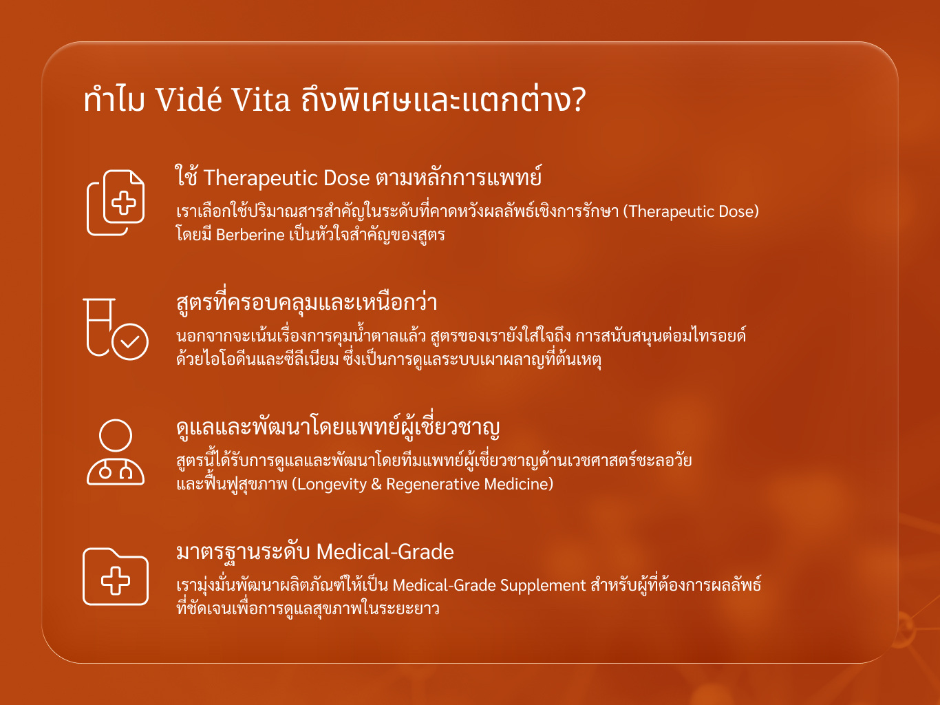 • มาตรฐานระดับ Medical-Grade: เรามุ่งมั่นพัฒนาผลิตภัณฑ์ให้เป็น Medical-Grade Supplement สำหรับผู้ที่ต้องการผลลัพธ์ที่ชัดเจนเพื่อการดูแลสุขภาพในระยะยาว