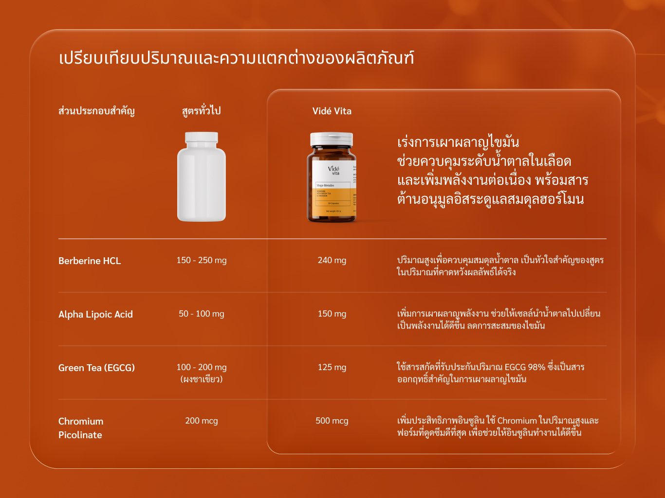 ตารางด้านล่างนี้คือการเปรียบเทียบปริมาณสารสำคัญ "บางส่วน" ในสูตรของเรา กับปริมาณโดยทั่วไปที่พบได้ในผลิตภัณฑ์เสริมอาหารตามท้องตลาด เพื่อแสดงให้เห็นถึงความมุ่งมั่นและความแตกต่างของเรา